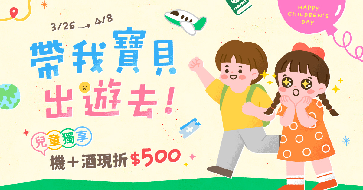 兒童節快樂,快帶家中的小寶貝一起出發旅行吧!活動期間3/26 ~ 4/8訂購全航線機加酒,每位兒童折500元,暢玩主題樂園、探索城市景點,和孩子一起創造難忘美好的回憶!