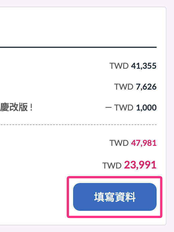 1. 確認訂購的飯店與航班後,進入「填寫資料」頁。