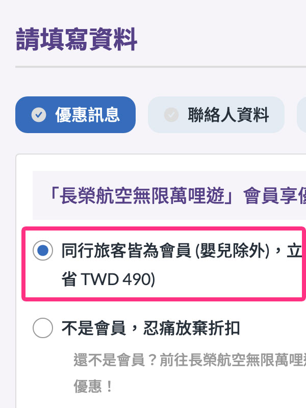2. 於「優惠訊息」中點選「同行旅客皆為會員(嬰兒除外),立即享有折扣」。