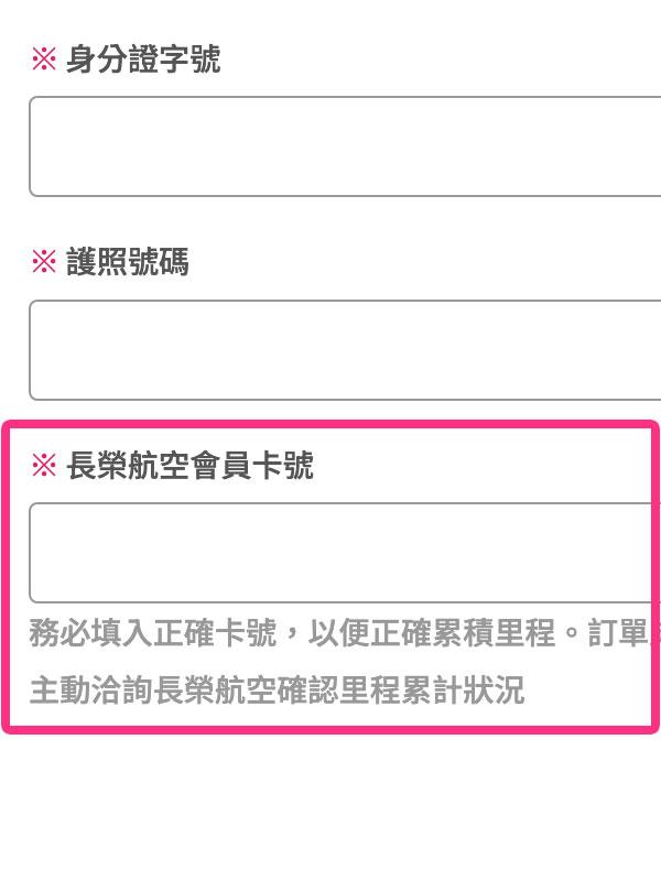 3. 於「旅客資料」中填入「每位」旅客的長榮航空會員卡號,完成登錄。