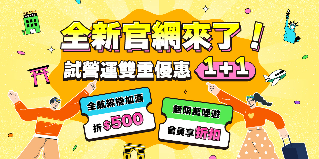 ★ 全航線機 + 酒現折500元活動期間於官網訂購機加酒,不限航點及出發日期,享每人折扣金額500元。 • 活動期間:2024/09/10 ~ 2024/09/30 • 適用出發日期:不限 ※ 注意事項: