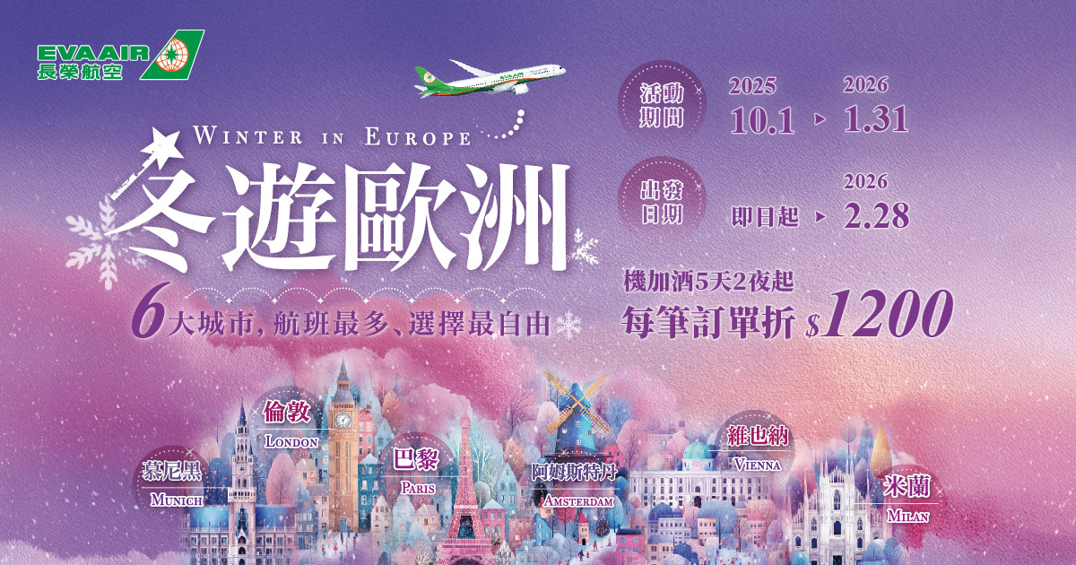 冬遊歐洲免轉機,機加酒現折TWD 1,200